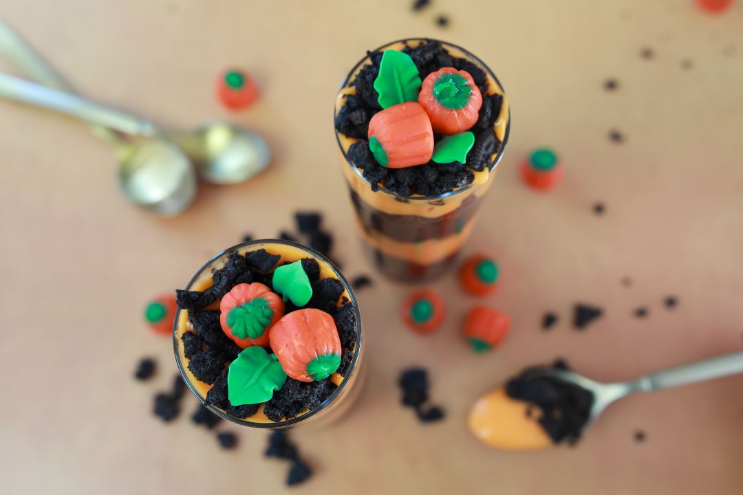 A fun fall treat made with pudding, crushed oreos and box brownies and candy pumpkins. This is a quick and easy recipe to share with your readers that doesn't require homemade components, just some basic assembly to create a seasonal fun fav great for kids gatherings and Halloween